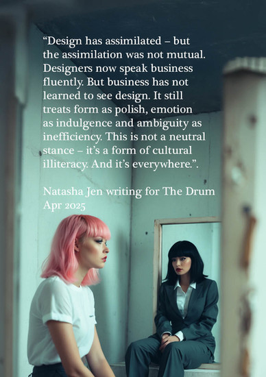 She writes “Design has assimilated – but the assimilation was not mutual. Designers now speak business fluently. But business has not learned to see design. It still treats form as polish, emotion as indulgence and ambiguity as inefficiency. This is not a neutral stance – it’s a form of cultural illiteracy. And it’s everywhere.”.