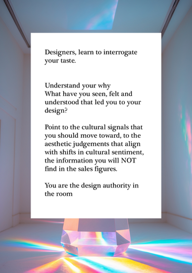 Point to the cultural signals that you should move toward, to the aesthetic judgements that align with shifts in cultural sentiment, the information you will NOT find in the sales figures.